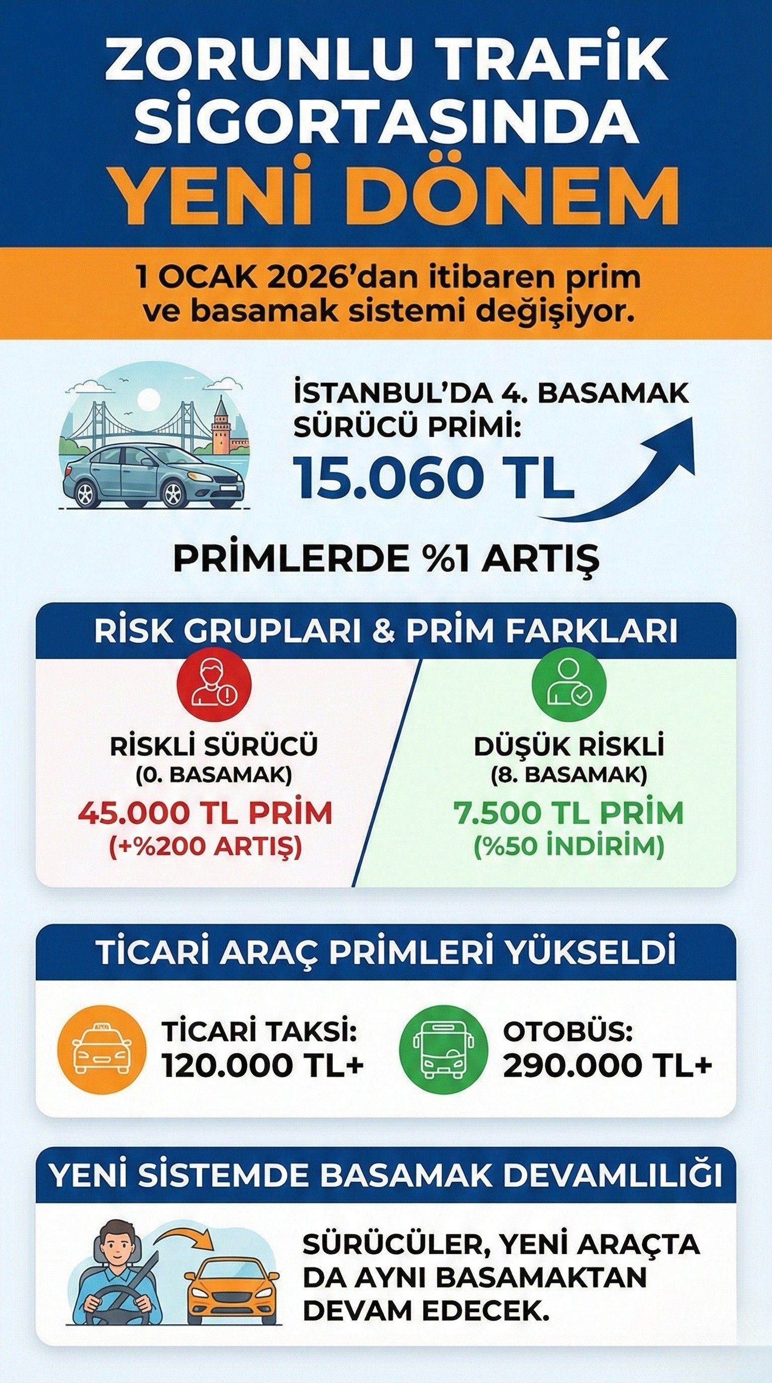 Zorunlu trafik sigortası poliçe primleri SIGORTA BİLGİ MERKEZİ tarafından yayımlanan son verilerle güncellendi. Açıklamaya göre 1 Ocak 2026’dan itibaren sigorta basamak sistemi ve prim uygulamalarında önemli değişiklikler yürürlüğe girecek. Bu ay itibarıyla primlerde ortalama yüzde 1 artış gerçekleşti.